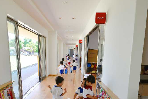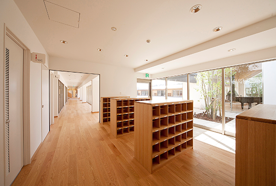 一階の保育室からは園庭へ出られる動線で、活動の幅が自然に広がります。