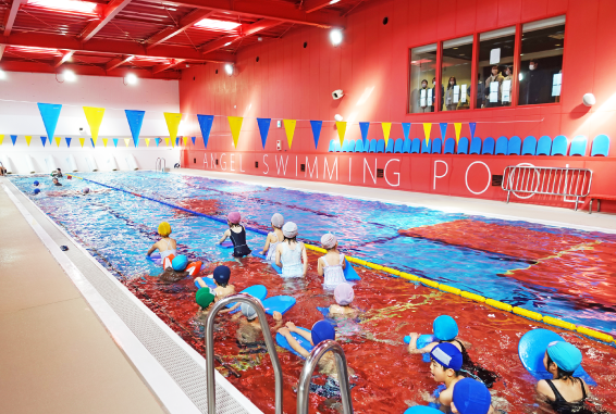 2歳児クラス後半から水に親しみはじめ、自然に泳ぐ感覚や水泳の基礎を身につけていきます。