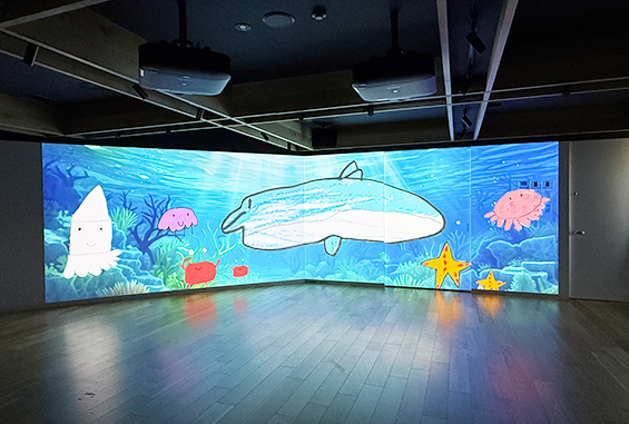 天然木の空間に200インチスクリーンを2面設置した、落ち着きと先進性が調和するラボです。
